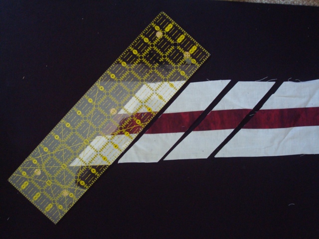 From the diamond fabric cut one strip 1 3/4" x width of fabric and from the background fabric cut two strips 2" x width of fabric. The diamond chain is the center strip and the outside strips are the background. Sew the diamond fabric between the background fabric. Press toward center.